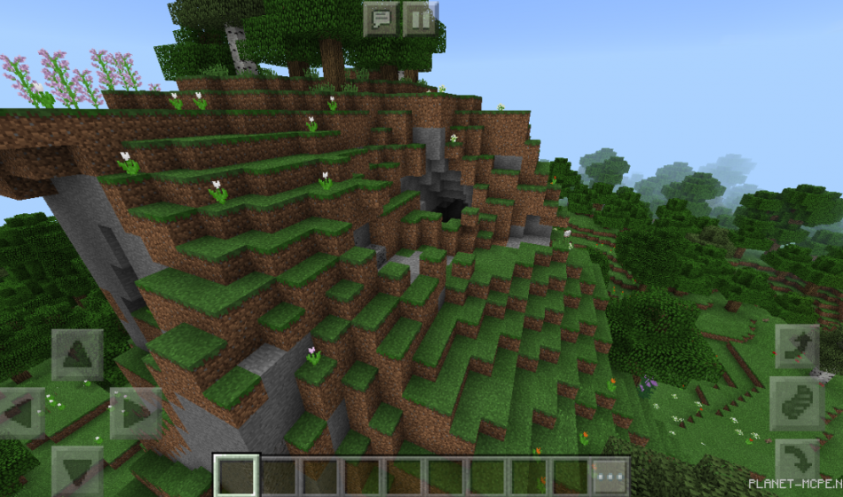Также в Minecraft Pocket Edition в горе есть пещера, в которой можно спрятаться от дождя, однако не от мобов, ведь они любят тьму в Minecraft PE 1.2, также вы сможете увидеть рядом растущие цветы на площадке MCPE.