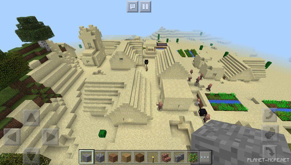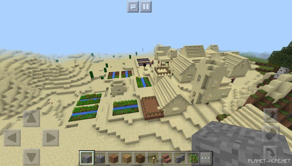 На площадке Mcpe в пустыне есть большая деревня, которую стоит посетить тем игрокам, которые не любят строится или же добывать полезные ресурсы.