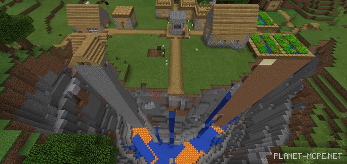 На этом сиде в Minecraft PE 1.2 вы появитесь рядом с оврагом, который проходит по кругу, но к счастью вы сможете увидеть круг не полностью, а только половину, так как овраг вовремя перестал расходиться. Он находится рядом с деревней в Minecraft Pocket Edition. Жителем деревни повезло, так как если бы их деревня была расположена на том месте, где появился овраг, то жители были бы обречены на верную смерть в Майнкрафт Покет Эдишн. Ситуация ушла в благоприятное русло, так как осталось несколько сантиметров до оврага.