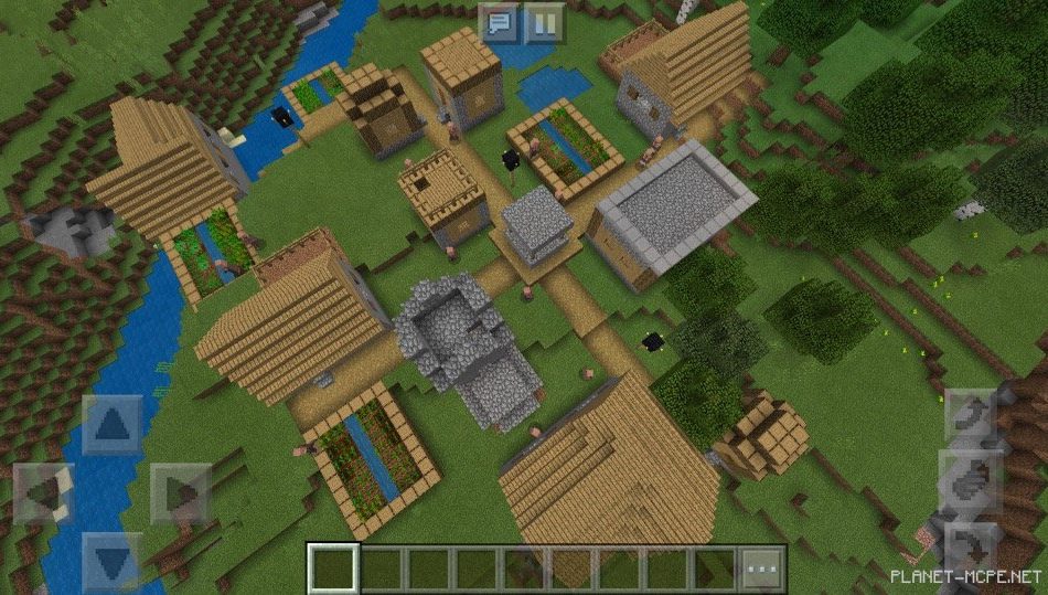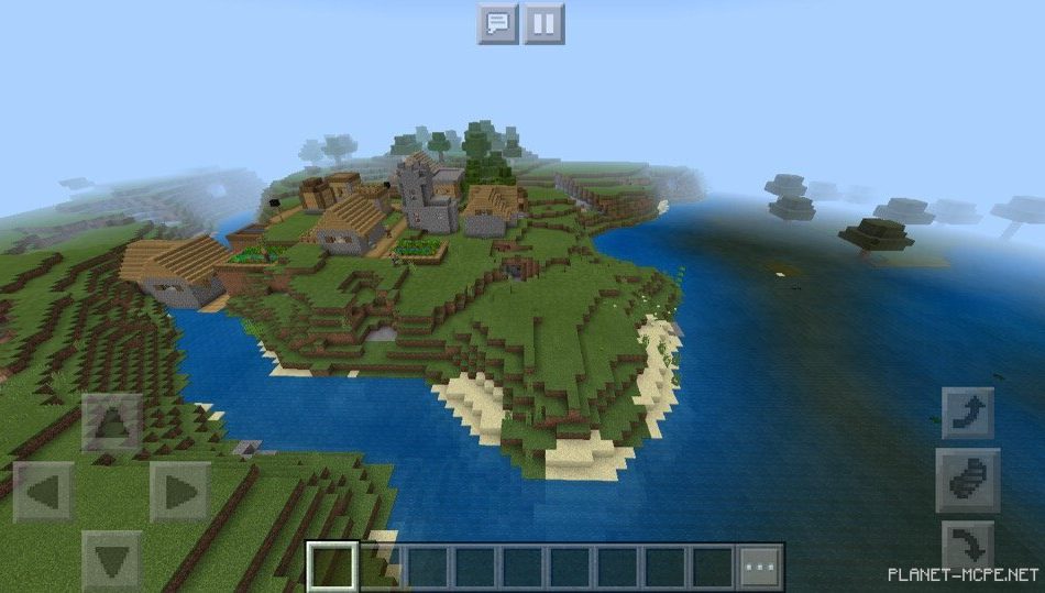 На этом сиде в Майнкрафт Покет Эдишн вы появитесь недалеко от небольшой деревни, расположившейся около большого водоема. В Майнкрафт ПЕ вы сможете увидеть большое количество растений, которые выращивают жители, а также деревьев растущих рядом в МКПЕ.