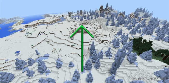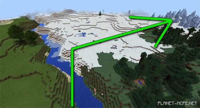 Вы заспавнитесь на равнинах в Майнкрафт Покет Эдишн. Чтобы попасть в снежный биом, вам придется пересечь реку в Майнкрафт ПЕ. На этом сиде есть красивейший ледяной лес, который точно поразит вас своей красотой на площадке МКПЕ, а также вы сможете увидеть небольшую реку рядом с деревней.
