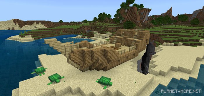 Это действительно крутой сид в Майнкрафт Бедрок, ведь здесь есть очень редкие явление. Сначала, может показаться что здесь нет ничего особенного, ведь вы заспавнитесь в лесу в Майнкрафт. Пройдя немного через лес, вы сможете увидеть судно, которое оказалось на суше после кораблекрушения. В затонувшем корабле есть сундук с сокровищами, а далее — небольшой овраг на суше.