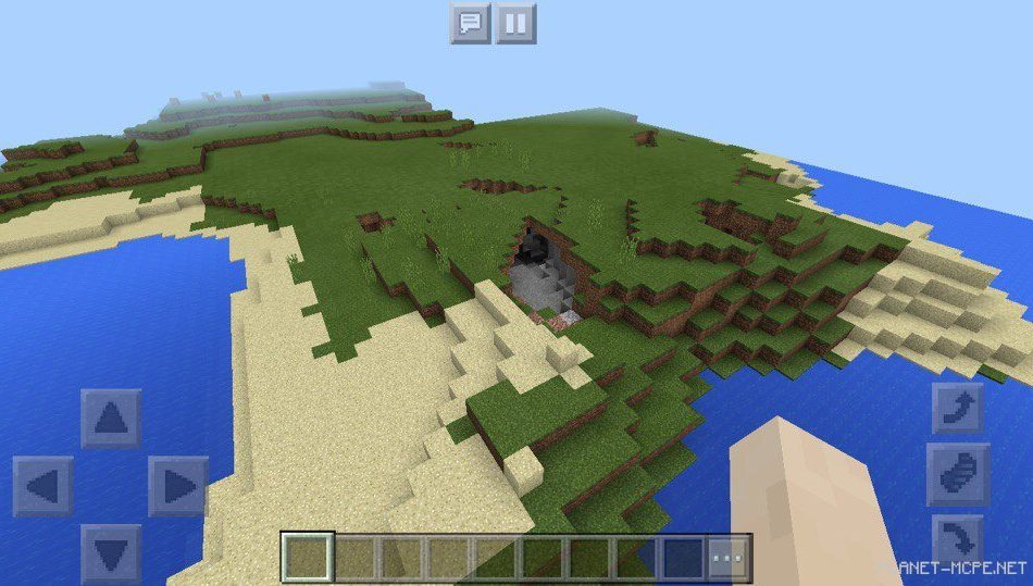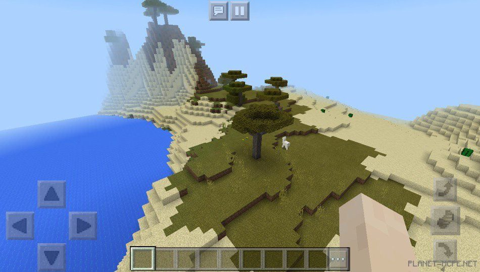 На этом сиде в майнкрафт покет эдишн есть красивые горы, а также биом с акацией, расположенный на берегу водоема в майнкрафт пе 1.2. В этом биоме есть ламы, которых можно приручить на площадке мкпе.