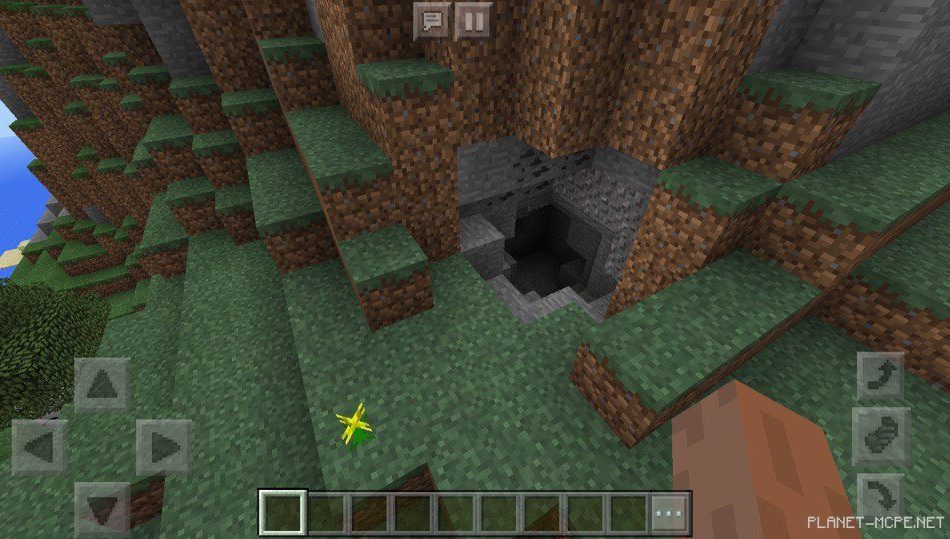 На этом сиде в майнкрафт покет эдишн есть пещера, которая расположена в горе. Она является маленько и сможет послужить укрытием игроку от мобов или дождя в майнкрафт пе 1.2.