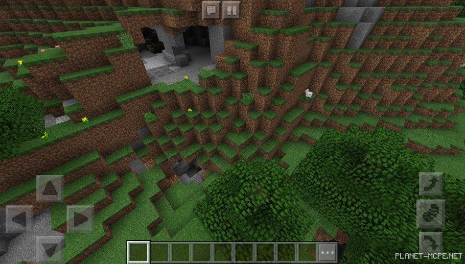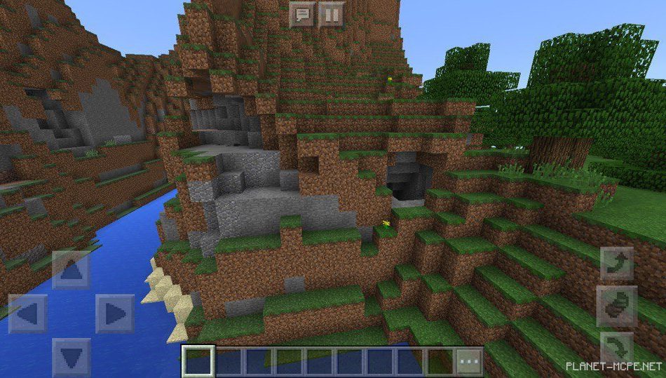 На этом сиде в Майнкрафт Покет Эдишн вы сможете увидеть пещеру, которая расположена в горе в Майнкрафт ПЕ 1.2. Там вы сможете раздобыть стартовые ресурсы для игры на площадке МКПЕ, а рядом есть лес.