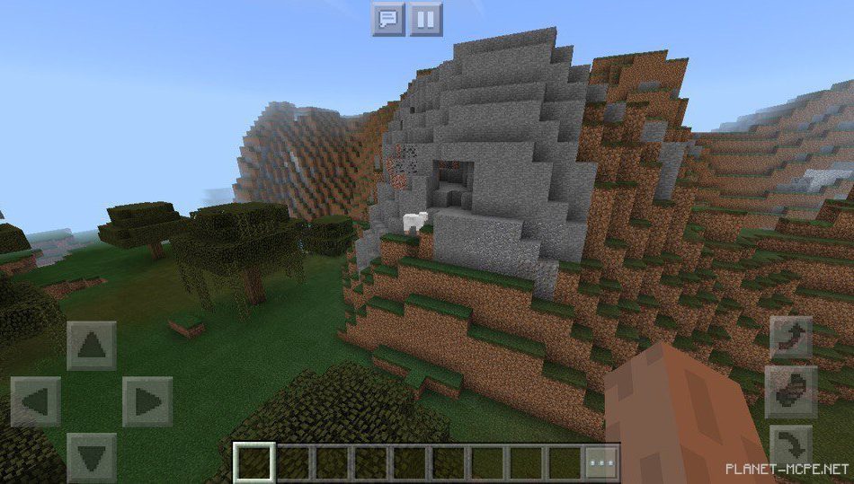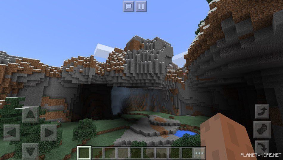 На этом сиде в Майнкрафт Покет Эдишн есть пещеры, а также необычные навесы в Майнкрафт ПЕ 1.2. Под этими навесами на площадке МКПЕ можно спрятаться от дождя, однако, там часто будут появляться мобы, ведь там темно в Minecraft Pocket Edition.