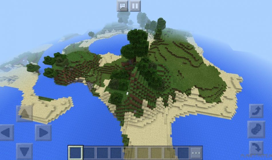 Если походить по территории, или же поплавать по территории Minecraft Pocket Edition, то можно дойти до огромного острова, на котором есть и песок и трава, даже есть водоемы и деревья в Minecraft PE, также можно заметить несколько различных цветков на площадке MCPE.