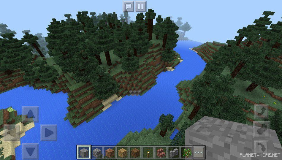 На этом сиде в майнкрафт покет эдишн вы появитесь в лесу, в котором растет хвоя в майнкрафт пе 1.2. В этом лесу протекает длинная извилистая река на площадке мкпе, в которой можно искупаться при этом дыша свежим воздухом в minecraft pocket edition.
