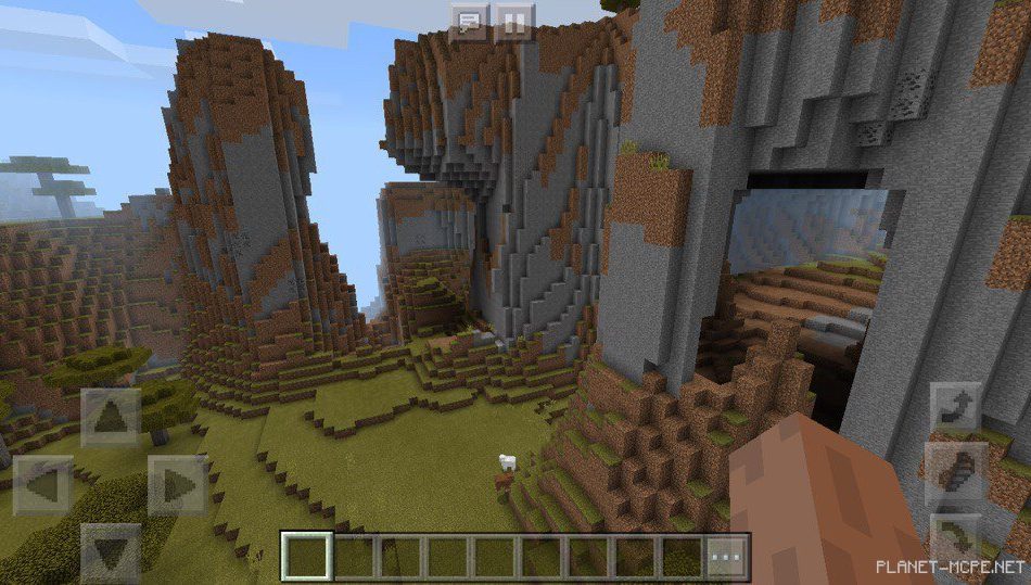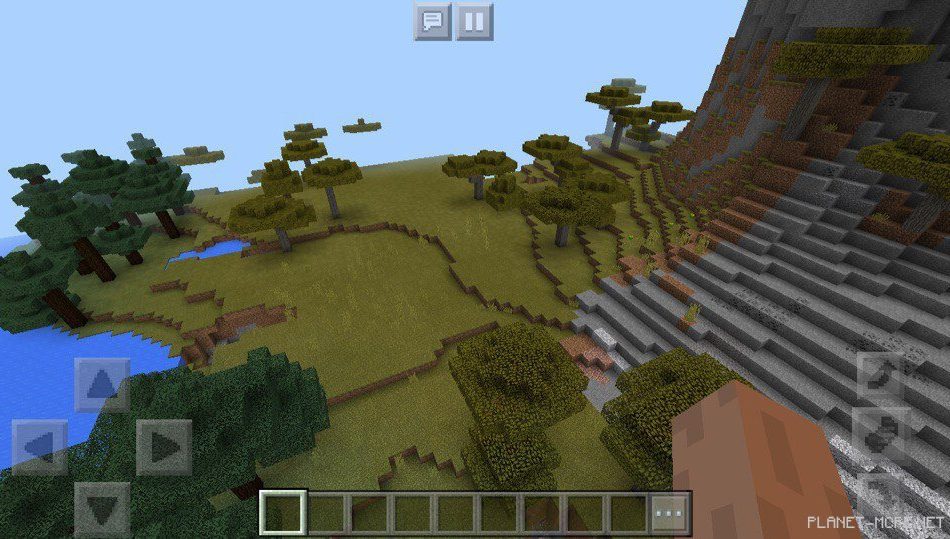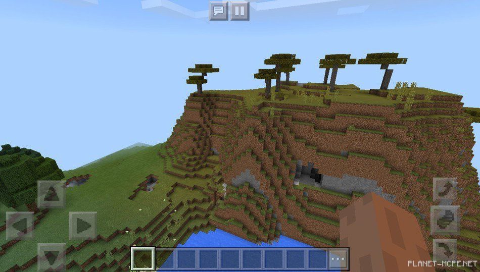 На этом сиде в майнкрафт покет эдишн вы будете располагаться в биоме, где есть деревья акации, а также есть неописуемо красивые горы, в которых есть проходы в различные пещеры в майнкрафт пе.