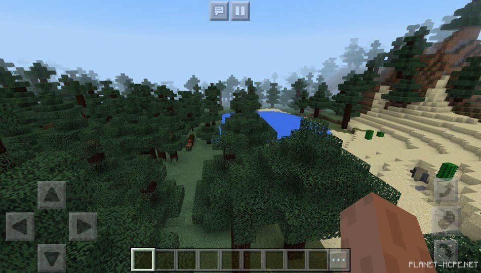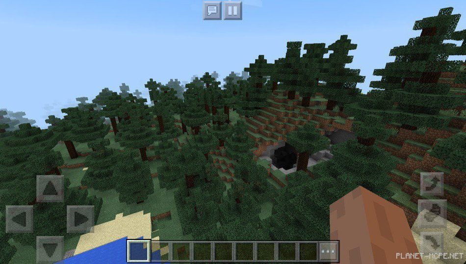 Вы сможете увидеть холмистые проторы, где также растут деревья. Внизу есть пещера, в которую можно забраться на площадке mcpe. Рядом есть хвойный лес, где можно раздобыть дерева, а также пещера с крутым спуском.