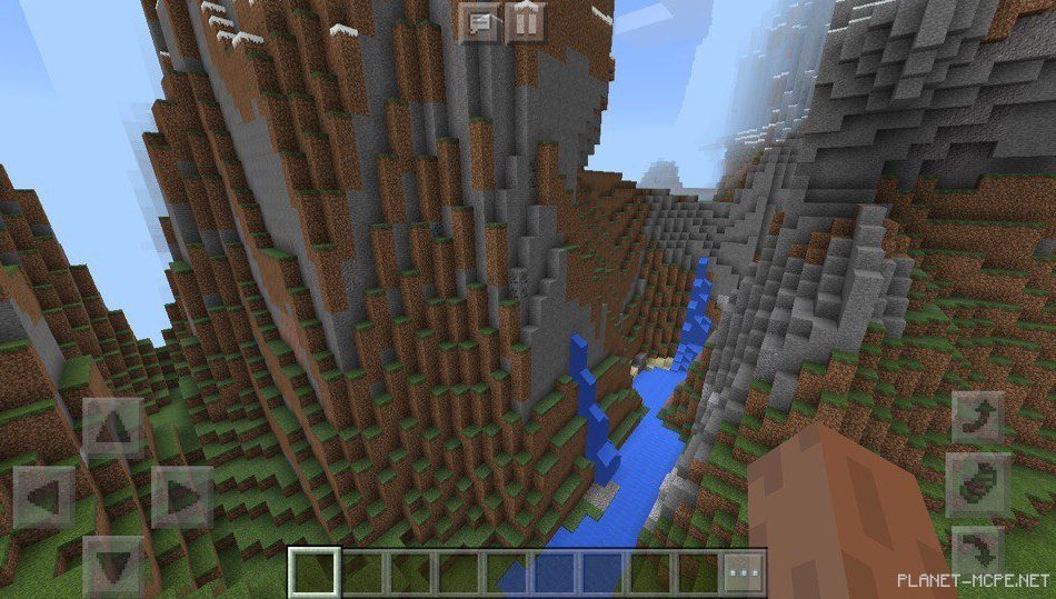 Также на этом сиде есть горы, которые очень высокие, если на них подняться, то можно будет почувствовать себя птицей на площадке MCPE. Также из гор вытекает несколько водопадов, которые выглядят забавно.