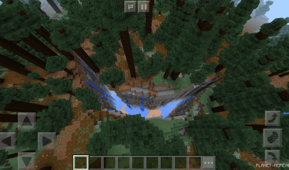 В Minecraft PE вы сможете увидеть огромный овраг, в который вы также имеете возможность спуститься по водопадам, которые стекают вниз со стороны леса!