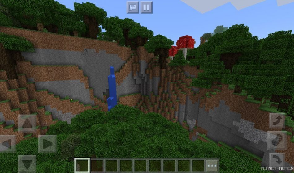 На площадке MCPE вы сможете увидеть возвышенность в темном лесу, а именно огромные горы, там же вы сможете увидеть еще большее количество темного дерева и грибов, а также из горы вытекается небольшой водопад в нижнюю часть леса.