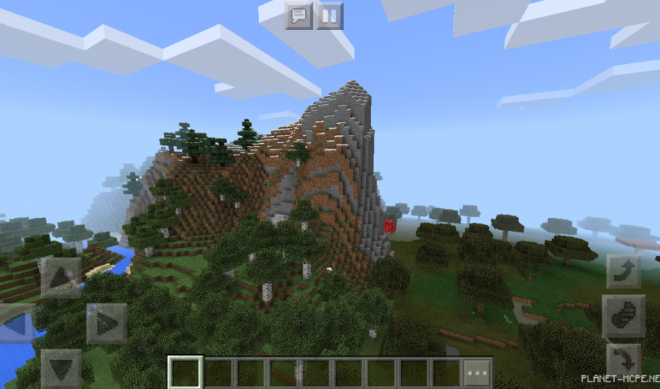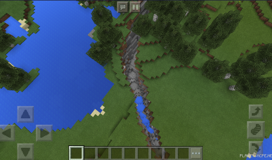 Также вы сможете увидеть овраг, который достаточно неплохо выглядит в Minecraft Pocket Edition, там вы сможете увидеть небольшое количество воды внизу, а рядом есть лес и большой водоем на площадке MCPE!