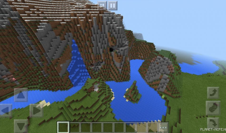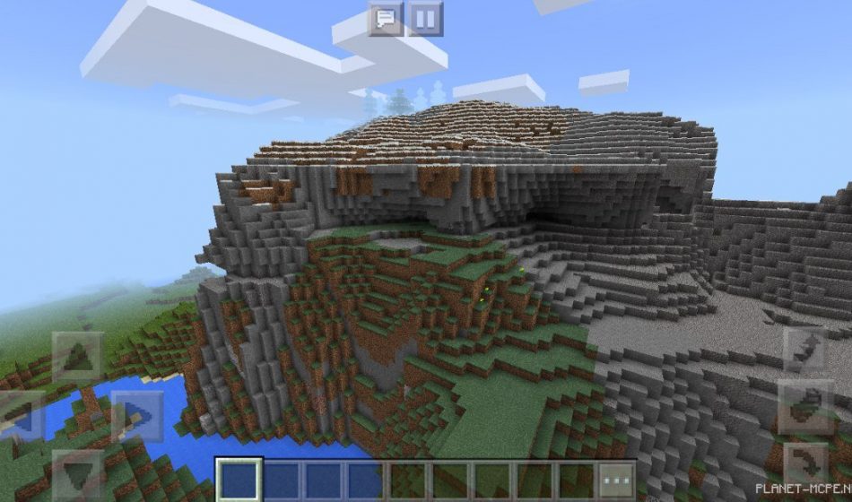 На этом сиде в Майнкрафт Покет Эдишн вы сможете увидеть необычные и огромные горы в Майнкрафт ПЕ, ведь под ними вы сможете спрятаться на площадке МКПЕ, а внизу протекает длинная речонка!