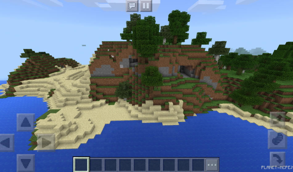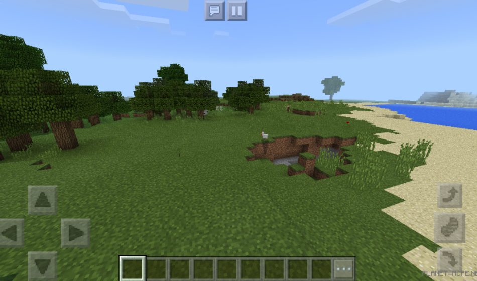 На этом сиде в Майнкрафт Покет Эдишн вы появитесь на территории, где есть много травы, а также есть песок, который можно раздобыть в игре. Также в Майнкрафт ПЕ рядом располагается небольшая пещерка в игре.