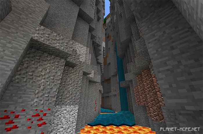 Овраг оказался очень длинным и глубоким. Если вы захотите прыгать вниз, то вы должны убедиться что прыгаете в воду в Minecraft PE.