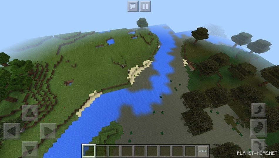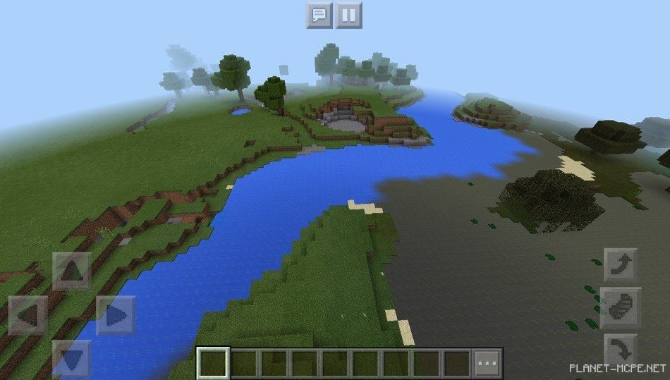 На этом сиде в Майнкрафт Покет Эдишн вы появитесь в местности, которая расположилась недалеко от болота. Здесь, вы сможете увидеть в Майнкрафт ПЕ 1.2 реку, которая вливается в болото и рядом есть круглый разрыв земли, который смотрится не плохо, а именно тот, который находится около леса в МКПЕ. Этот разрыв расположен у речонки, протекающая недалеко от леса.