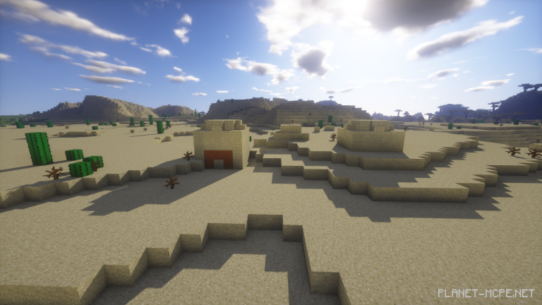 Пустыню, палящее солнце в Minecraft PE 1.1.5/1.1.0 также можно встретить во время игры на этом сиде. Полюбоваться на голубое небо, получить дозу положительных эмоций, а также немного загара. На площадке MCPE в храме спрятаны сундуки с различными вещами, однако они самые обычные.