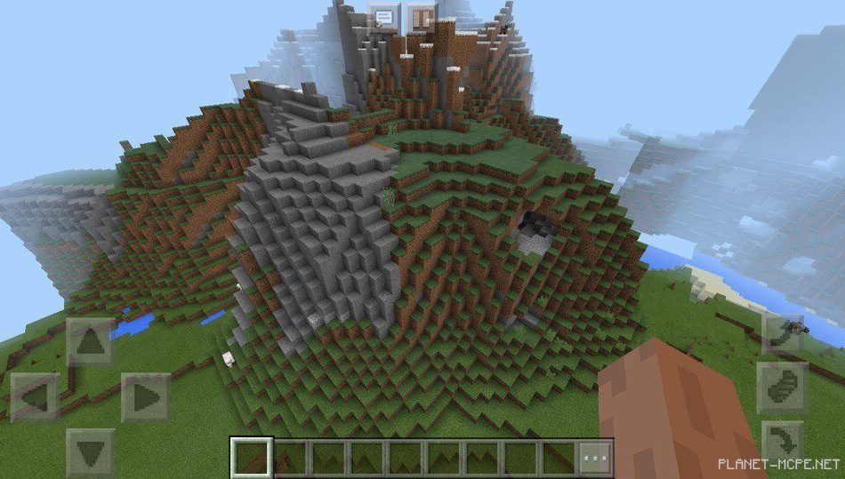 Также вы сможете увидеть гору, которая имеет круглую форму в Minecraft Pocket Edition, также в ней есть проход, который можно назвать пещерой в Minecraft PE, который будет довольно полезен, если вы захотите спрятаться на площадке MCPE.
