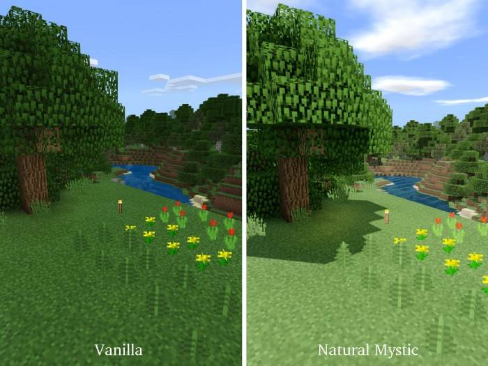 Шейдеры под названием Реалистичный мир (Natural Mystic) — это набор ресурсов для Minecraft Bedrock, цель которого сделать игру наиболее реалистичной. Естественно, они комплексно затрагивают в игре освещение.