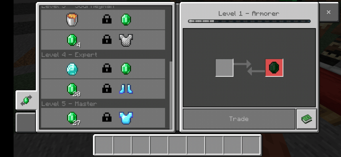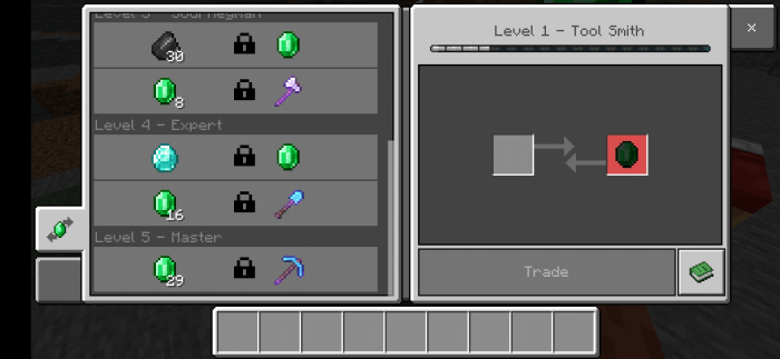 В Minecraft Bedrock Edition немного видоизменятся окна торговли – на недоступных товарах попросту будет висеть замочек. Естественно, при прокачивании замок пропадет, и вы сможете приобрести предмет или блок в MCPE.