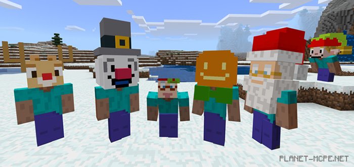 Текстуры «Christmas Heads Costumes (Головы Рождественских костюмов)» добавят в Minecraft Bedrock 6 новых изменённых голов, которые будут представлены в виде рождественских костюмов. Несмотря на то, что до Рождества ещё осталось достаточно времени, наденьте Ваши любимые рождественские пакеты вместе в этим костюмом. Санта, снеговик, эльфы и многое другое — что из этого вы выберете?