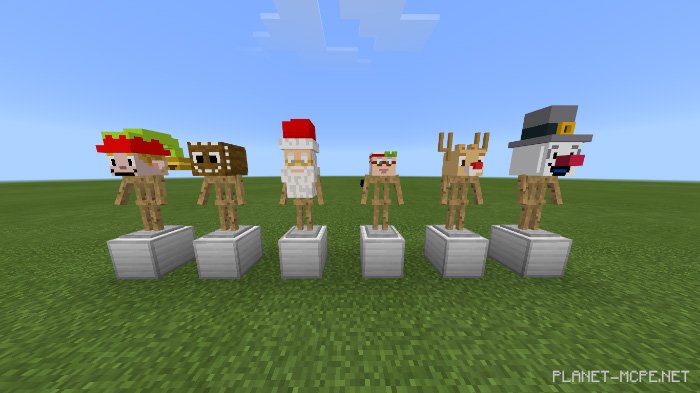 Все головы мобов и черепа мобов были заменены рождественскими головными уборами. Благодаря этому Вы сможете изменить свою внешность в Майнкрафт, используя, к примеру, головы Санты или Рождественского Оленя.
