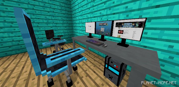 Текстуры «Decoration (Декорации)» добавляют в Майнкрафт ПЕ 6 новых мебельных и технологических продуктов, которые можно использовать для украшения Вашего дома в MCPE. Поскольку каждый из новых предметов заменяет либо голову, либо череп, их угол вращения никак не ограничен. Некоторые из новых предметов — это телевизор с плоским экраном, удобный диван и полный компьютерный набор.