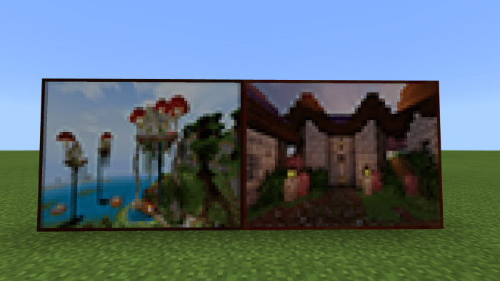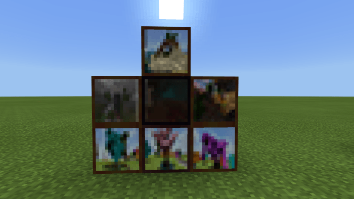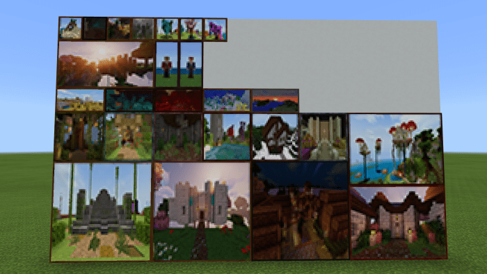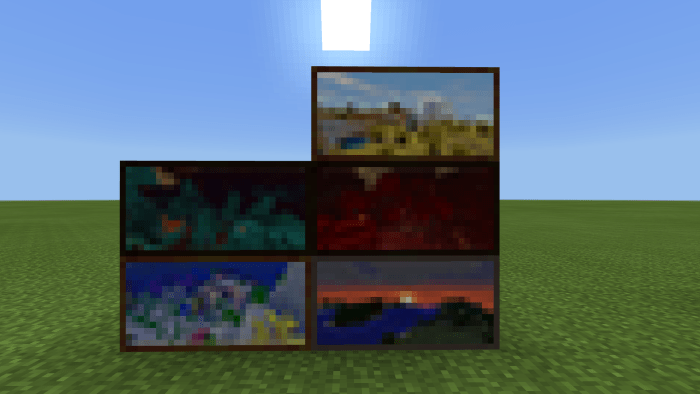 Пакет текстур «Dragon’s Minecraft Paintings (Картины Майнкрафта)» добавляет в Minecraft Bedrock новые картины разного размера и содержания.  Картины по биомам из Minecraft 1.16. Размер: 2×1. Это скины автора пакета, тот, что справа — с ПК, слева — Xbox. Размер: 4×4. Левая и правая взяты из Бедрока, а та, что посередине — из Java. Размер: 2×2. Верхний ряд: старое дерево, центр шахты, разрушенная башня. Нижний ряд: башня из мира выживания, дом разработчика пакета, городская исследовательская лаборатория. Размер: 3×4. Слева — Бедрок, справа — Java. Размер: 1×2. Это пейзажи саванны, искривленного леса, багрового леса, теплого океана и заката над равнинами. Размер: 1×1. Центральная картина — это долина песка души; нижний ряд: голубая береза, сакура и фиолетовая ива. Оставшиеся картины — это просто пейзажи. Размер: 2х4. Мост из Java Edition, соединяющий два плавучих острова.