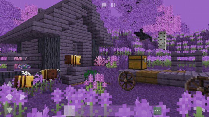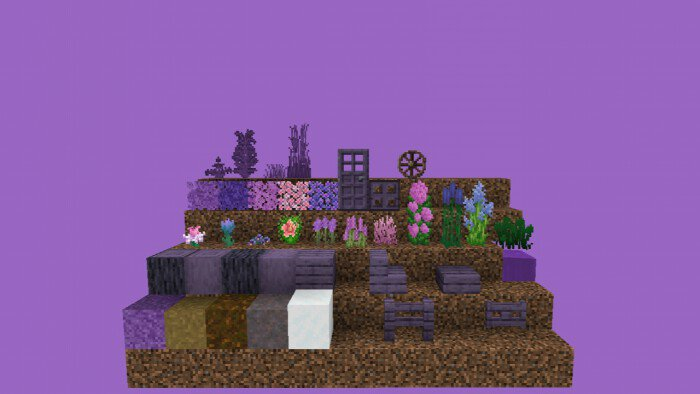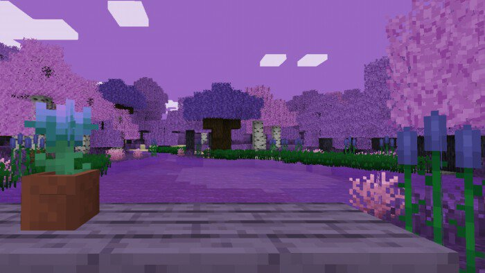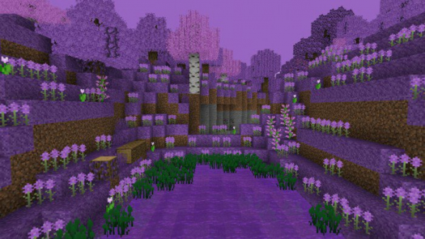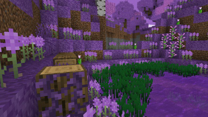 Пакет текстур «Flowering Season (Цветочный сезон)» добавляет в Minecraft сезон цветения! Все деревья и цветы приобретут фиолетовый цвет и станут очень насыщенными!Травяные блоки, трава, листья, небо и даже вода станут фиолетовыми. Также появится новое растение, которое заменит кувшинку Майнкрафта   Дубовые доски, лестницы, бревна, заборы, люки и двери тоже станут фиолетовыми.