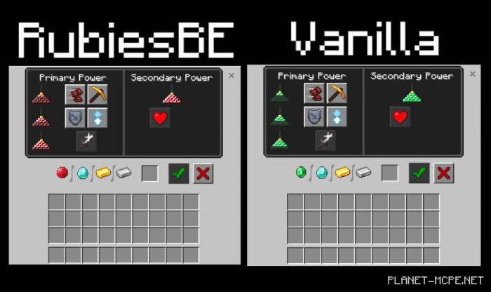 Вместо изумруда будет рубин, вместо изумрудной руды — рубиновая. Блок изумруда станет блоком рубина, а также изменится интерфейс маяка.
