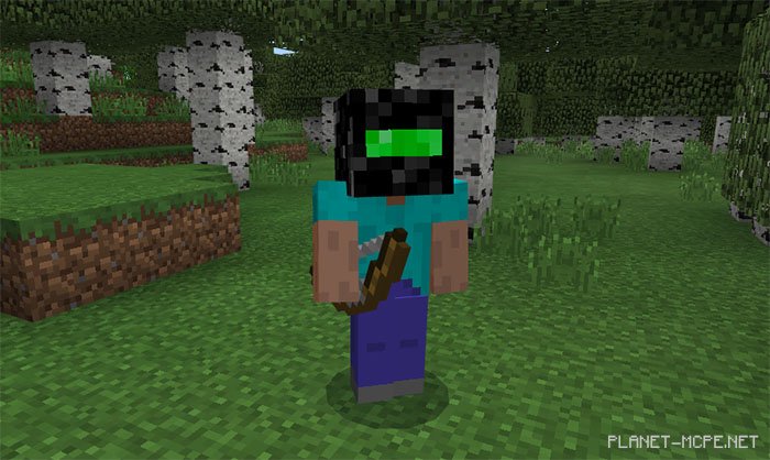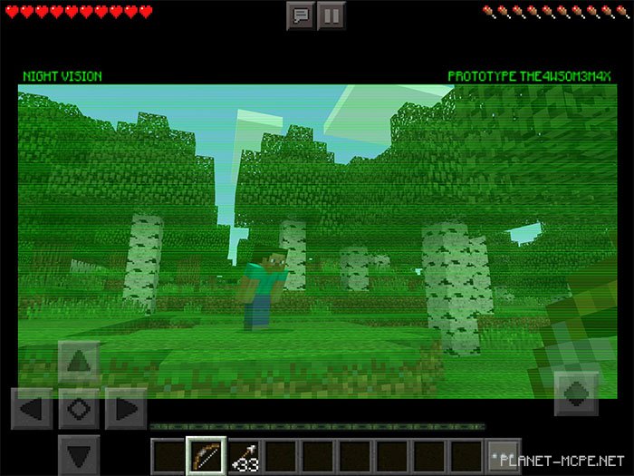 «Night Vision Goggles (Камера ночного видения)» — это довольно простой пакет текстур, который добавляет в Minecraft PE отличную функцию камеры ночного видения. Это делается при помощи замены существующей в игре тыквы новыми текстурами. Как Вы, возможно, знаете, пользовательский интерфейс в Майнкарфт ПЕ меняется при ношении тыквы. Однако, поскольку этот пакет не изменяет большую часть поведения, Вы не будет видеть гораздо лучше, чем раньше. Но это выглядит здорово!