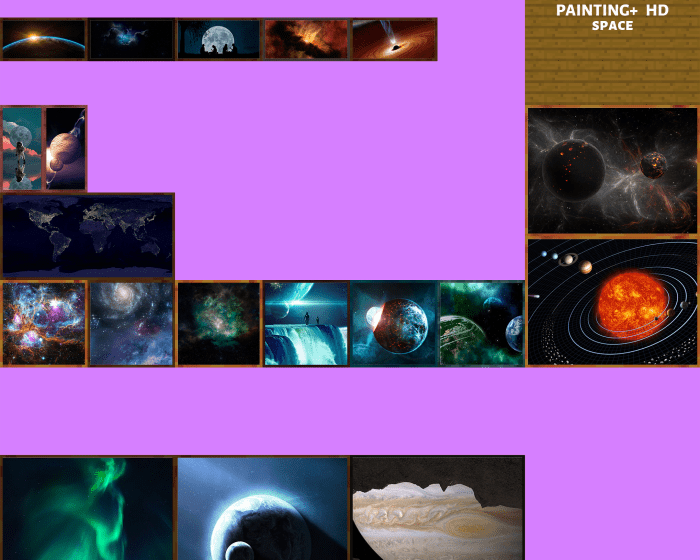 Наскучили картины ванильного Майнкрафта ? С пакетом текстур «PAINTING+ HD SPACE (Картины + HD космос) » Вы сможете заменить все картины на новые! Вместо однотипных пейзажей у Вас появятся разнообразные космические изображения, причем в HD -качестве с разрешением 512×512.