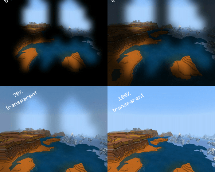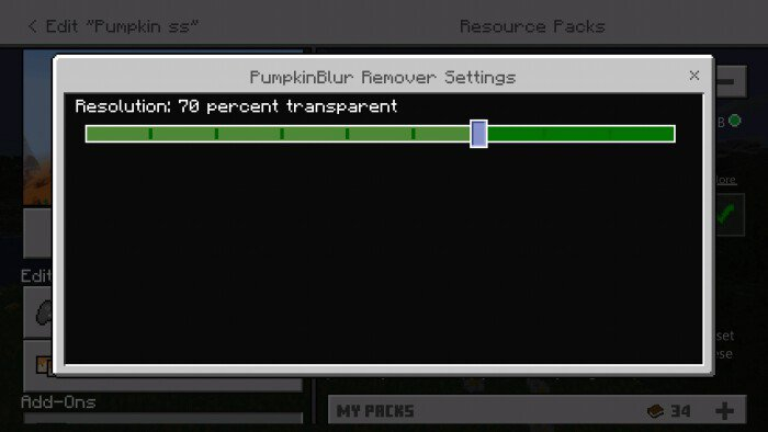 Носите тыкву на голове своего персонажа Minecraft в качестве защиты, и Вас раздражают это неудобные прорезы для глаз и рта? Пакет текстур «Pumpkin Blur Remover (Удаление пятен тыквы)» понижает прозрачность темных пятен до их полного исчезновения! Чтобы активировать пакет в Майнкрафте, следуйте инструкции ниже. Ползунок позволяет изменить прозрачность темных зон. Так это выглядит в игре: