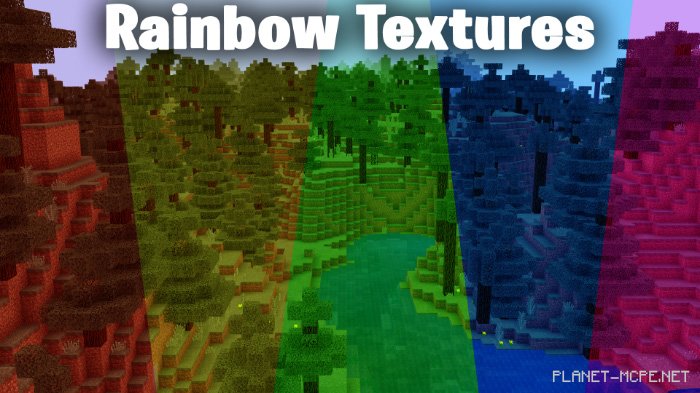 Пакет текстур «SG Rainbow Environments (Радужная окружающая среда)» — это отличный способ оживить Ваш мир Minecraft! Он изменит цвета биомов на 5 различных настраиваемых цветов. Красный, зелёный, жёлтый, синий и фиолетовый! Этот пакет изменит в Майнкрафт Бедрок довольно много вещей, таких как листья, деревья, траву, папоротники и лосось, а также немного более скрытые вещи.