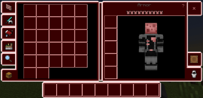 В новых версиях Майнкрафта дизайнеры вносили изменения в фон основного экрана, но они всегда придерживались одного стиля, поэтому чего-то совершенно нового никогда не было. Авторы текстурпака «Lunar Eclipse Theme (Тема лунного затмения)» подошли к оформлению игры с другой стороны и заменили яркий интерфейс на темный, добавив к нему кроваво-красный цвет в кнопки и слоты.