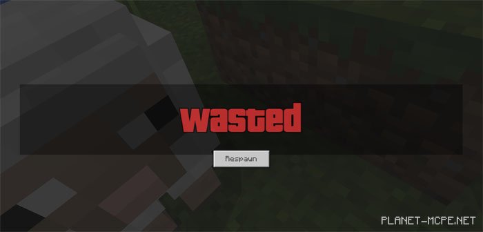 Любой человек, игравший в GTA (Grant Theft Auto), должен быть знаком с этим пакетом текстур «GTA Wasted Screen (Экран «Потрачено» из ГТА)». Экран Wasted появляется в Grand Theft Auto, если игрок теряет все свое здоровье, будучи тяжело раненым или схваченным полицией. Данный пакет текстур переносит этот экран смерти в мир Майнкрафт ПЕ. Звуки также были изменены, чтобы быть более гармоничными с экраном смерти в GTA.